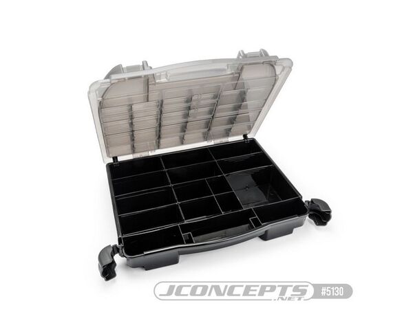 Die Trennwände in herkömmlichen Aufbewahrungsboxen sind praktisch, neigen aber dazu, während des Gebrauchs zu verrutschen, sich zu verschieben und herauszufallen. JConcepts hat sich zum Ziel gesetzt, diese Trennwände zu sichern, indem sie ein System entwickelt haben, bei dem die Trennwände mit einer Schraube am Boden der Box befestigt werden. Alle Trennwände können mit dem mitgelieferten Material befestigt werden. Das Innere der Box ist so gestaltet, dass mehr RC-spezifischer Raum und Positionen für horizontale und größere vertikale Platzprobleme zur Verfügung stehen.