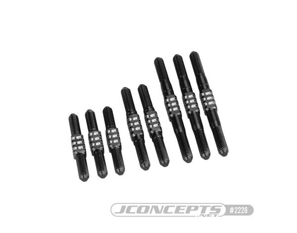 JConcepts RC10 Classic Fin titanium turnbuckle set, black - 8pc. (Fits – Original RC10 and RC10 Classic) JConcepts introduces a stylish, durable, and lightweight alternative Titanium turnbuckle kit for the popular original Team Associated RC10 and RC10 Classic vehicles in black color. JConcepts is Titanium with the introduction of the Fin turnbuckle sets designed specifically for style, durability, and performance. The base of the shafts design is centered around a .143” titanium hex size which gradually tapers down into a 3mm thread base design which accepts standard AE ball-cup configurations. The focus of the styling surrounds the lengthened adjustment hex area and the “fin” cuts that rotate about the center. The Fin turnbuckles are lightweight, and the original design brings out the glamour and quality that makes titanium one of the most sought, after exotic materials in the world. The JConcepts turnbuckles are produced with left- and right-hand threads with the left b