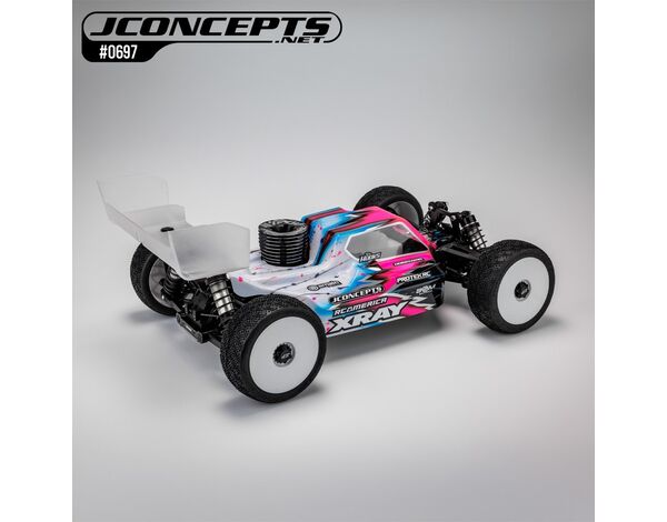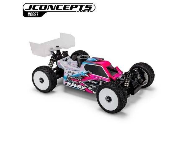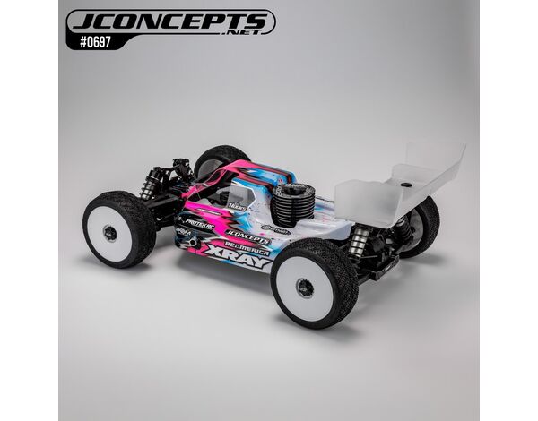 Sie zeichnet sich durch ihre markante Kabinenform mit Vorwärtsausrichtung aus und integriert mittige Winglets sowie einen hinteren Stabilizer-Kick-up für noch mehr Balance. Ein „Shark Fin” auf dem Dach erhöht die Stabilität und Spurtreue, während die stark abgeschrägten Side-Pods in klassische JConcepts-Designelemente übergehen. Die passgenaue Karosserie ist auf den XB8 2025 zugeschnitten und ermöglicht eine einfache Montage mit sauber gestalteten Befestigungspunkten.