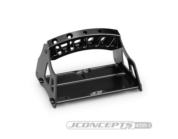 JConcepts tool holder - black We all know that racers crave organization. Tools are one of the most important items a racer can have at their immediate disposal. JConcepts now has a fresh take on the tool holder that displays well, fits in to pit space conveniently, and places the tools in a more ergonomic position. The multi-piece item also has a storage mode and can quickly be disassembled to easily be tucked away during travel. The tool holder starts with a CNC machined base that boasts pockets to place miscellaneous items during a typical race day. The base has extended features that allow for the carbon fiber legs to lock in to place for a healthy footing. The component which holds the tools is a beefy and detailed CNC machined plate which has 5 different bored locations for your tools. There are several highlighted pockets to remove weight and to give the most trick look possible. The all billet aluminum and carbon fiber assembly has an additional touch of authenticity. The