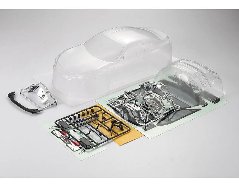 Klare Karosserie / nicht ausgeschnitten / Scheibenabkleber / Logo Aufkleber / Zubehör Set 1 verchromt (vordere & hintere Scheinwerferreflektoren, Auspuff, Kühlergrill, Rückspiegelgläser) / Plastik Zubehör Set (Scheibenwischer, Rückspiegel, Heckflügel, Nummernschilder, Antenne) / Lexan Teile Set (Klare Scheinwerfergläser) / Kleinteile Set (O-Ringe, Karosserieclips, LED Stopper, Doppelseitiges Klebeband, Aluminiumtape) / Montageanleitung