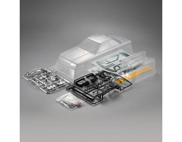 Der klaren Lexankarosserie des Nissan Skyline R31 liegen für ein authentisches Aussehen viele Kunstoffteile bei. Scheinwerfereinsätze, Auspuffendrohr und weitere Kleinteile sind z.B. verchromt.