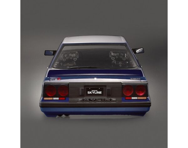 Die Karosserie des Nissan Skyline R31 ist in bekannter Killerbody Qualität gefertigt, blau lackiert und bereits mit den Aufklebern versehen.