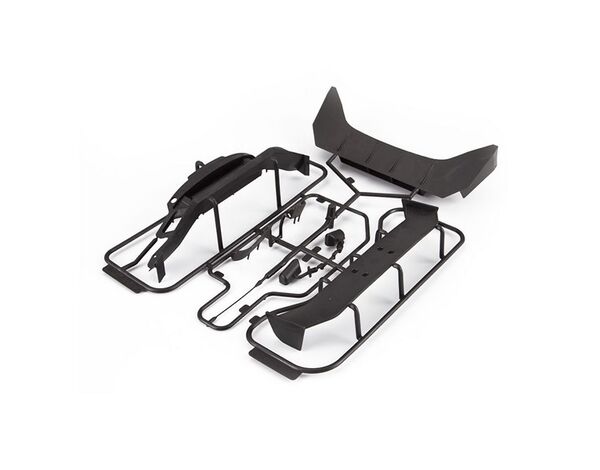 Set aus schwarzen Plastikteilen bestehend aus Front/Heck Spoiler, Heck- und Kehrflügel, Scheibenwischer, Antenne und Außenspiegeln.