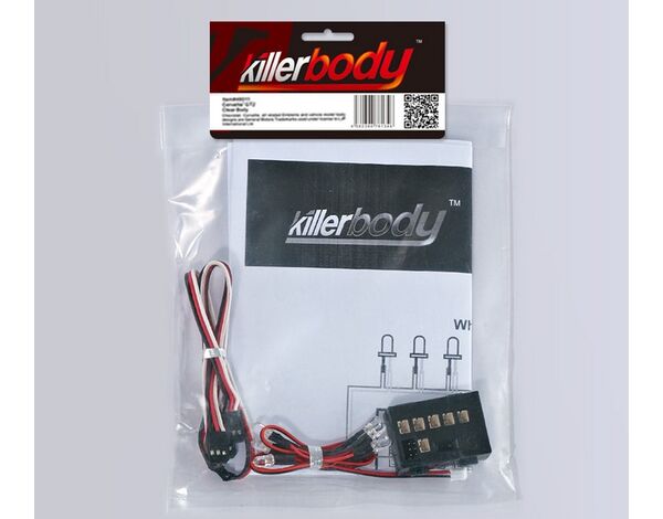 Killerbody LED Licht Set mit 6 LED inkl Kontroller Box Einfach und schnell zu installierendes LED Licht / Scheinwerfer Set von Killerbody. Es lässt sich nahezu universell in jedem 1/10 Fahrzeug bzw. der Karosserie nachrüsten. Optimal passt das Set natürlich in die Karosserien von Killerbody welche Teilweise bereits Vorrichtungen zur Installation enthalten haben. Sämtliche Kabel sind dabei bereit fertig konfektioniert und garantieren eine reibungslose Montage. Gerade bei Fahrten in Dunkelheit lässt es das Fahrzeug noch realistischer wirken, macht aber auch bei Helligkeit eine gute Figur. Dank der Steuereinheit gibt es die Befehle der Fernsteuerung bzw. Zusatzkanäle optimal wieder, egal ob Blinker, Bremslicht, Abblendlicht oder Warnsignal (je nach verwendeter Konfiguration und Umfang der angeschlossenen LED's) lassen sich wie bei den Großen simulieren. Lieferumfang: 1x LED Steuerbox 1x Verbindungskabel 1x LED Set mit 6 weißen LED's