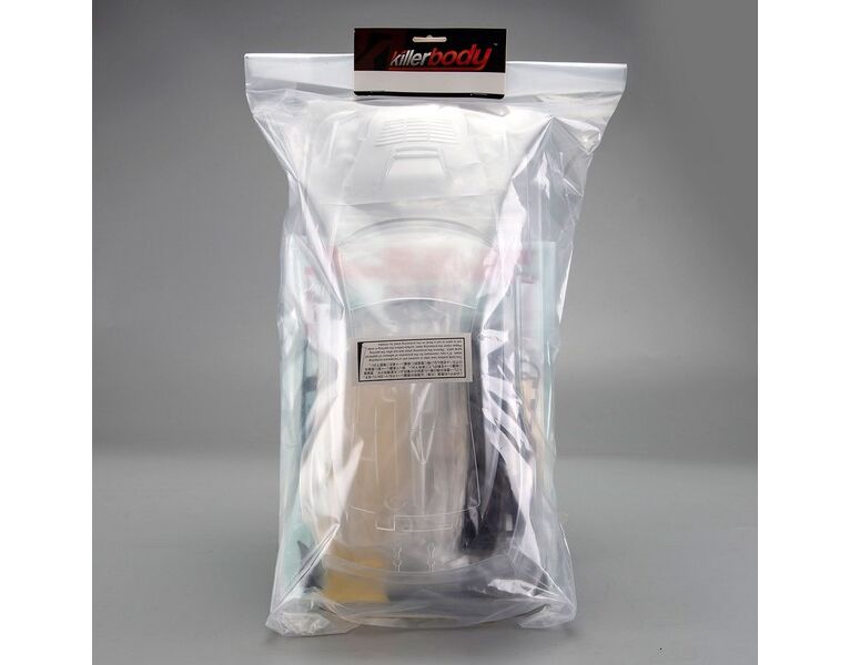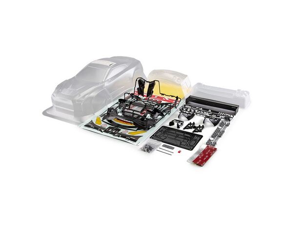 Unlackierte Karosse / Lackier-Schutzfolie und Fensterabkleber / Standard Decal Set / Schwarzes Anbauteile-Set (Plastik) / Anbauteile Set (Lexan) / Lufteinlassgitter (rostfreier Stahl) / Beutel mit diversen Kleinteilen / Anleitung