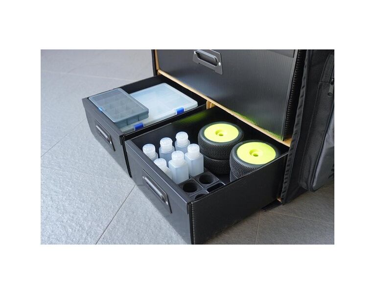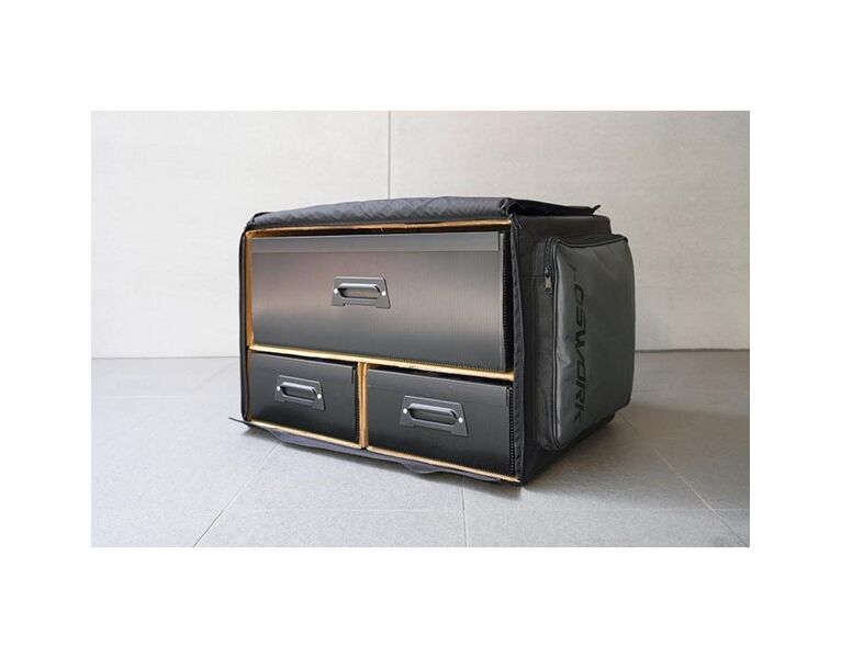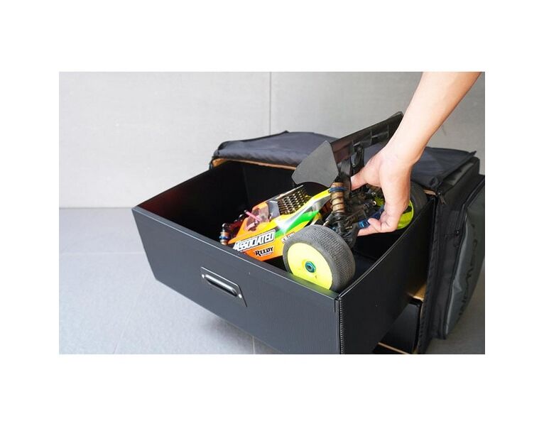 Die Koswork 1/8 Compact 3 Drawer Buggy/Onroad Car Bag ist die perfekte Lösung für alle, die ihre 1/8 Fahrzeuge und Zubehörteile kompakt und übersichtlich transportieren und aufbewahren möchten. Die Tasche bietet eine große Schublade für das Fahrzeug und zwei mittelgroße Schubladen für Teile und Zubehör. Die stabilen Pappboxrahmen und die seitlichen Taschen sorgen für zusätzlichen Schutz und Stauraum.