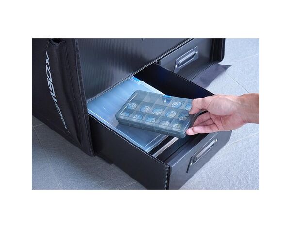 Bereiten Sie sich optimal auf Ihr nächstes RC-Rennen vor mit der Koswork 1/8 Compact 3 Drawer PP Frame Buggy/Onroad Car Bag. Diese kompakte, vielseitige und funktionale Tasche ist speziell entwickelt worden, um Ihre 1/8 Fahrzeuge, Teile und Zubehör ordentlich und sicher zu transportieren.