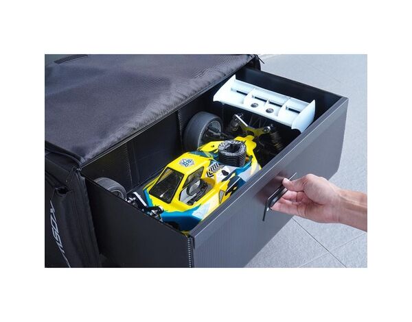 Die Tasche verfügt über eine robuste, verstärkte und wasserdichte Wellkunststoffrahmen-Version, die für zusätzlichen Schutz und Langlebigkeit sorgt. Die praktische kompakte Größe macht den Transport zum Kinderspiel, während das durchdachte Design mit einer großen Schublade für Ihr 1/8 Fahrzeug und zwei mittelgroßen Schubladen für Teile und Zubehör ausgestattet ist.