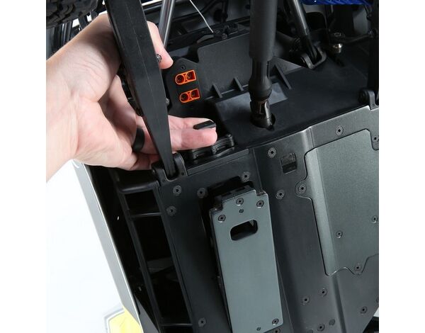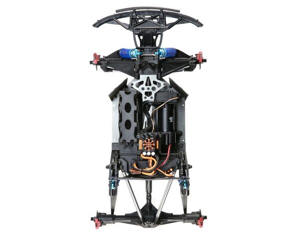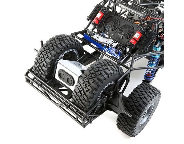 Just like the 1:1 desert trucks, the Super Baja Rey 2.0 comes with a super-rigid roll cage made of super-tough composite material that enhances the truck's scale looks and durability. It is integrated with the 4mm anodized aluminum chassis plate providing the ultimate protection for your truck and electronics.