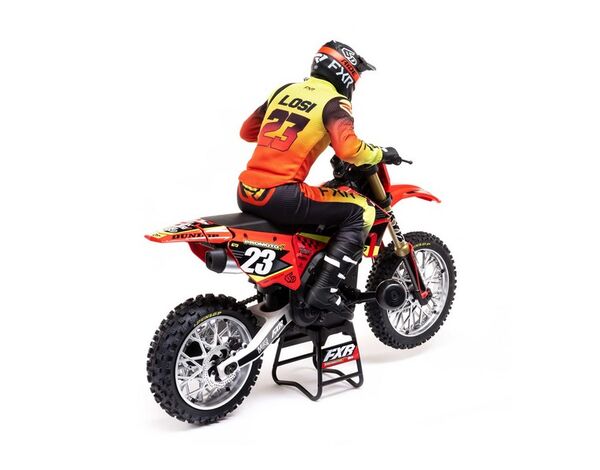 Das Losi Promoto-MX wird komplett montiert geliefert. Ebenso ist ein hochwertiges Spektrum Smart-Fernsteuersystem im Lieferumfang enthalten und die Bordelektronik ist bereits installiert. Auch AA-Senderbatterien werden mitgeliefert. Setze einfach deinen 2S LiPo-Akku mit IC5-Stecker ein und nutze dein kompatibles Ladegerät und schon kann es losgehen.