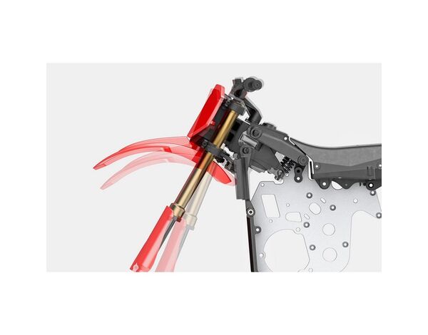 Die Vordergabel des Promoto-MX ist ein völlig neues und modernes Design mit interner Feder und Dämpfer. Die Gabelrohre sind so konzipiert, dass sie ähnlich wie normale RC-Stoßdämpfer funktionieren, und können durch Austausch der Silikon-Dämpfungsflüssigkeit umgebaut und abgestimmt werden. Mittels entgegengesetzter oberer und unterer Feder kann mit Distanzstücken auch die Fahrhöhe des Promoto-MX angepasst werden. Und was vielleicht am wichtigsten ist: Die Gabel sieht fantastisch aus – genau wie das Original.