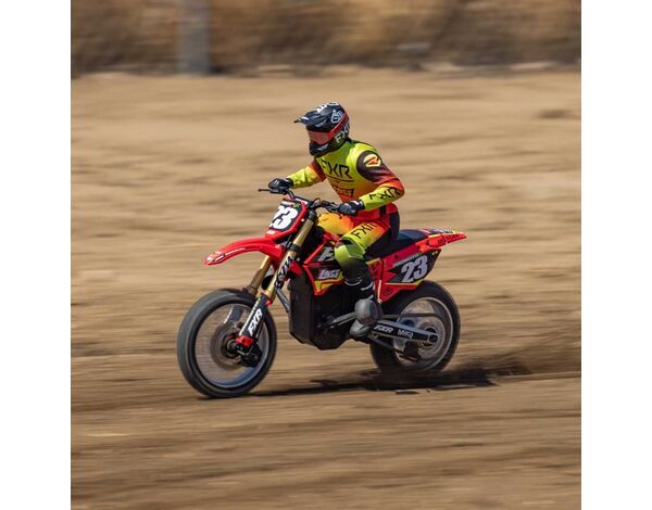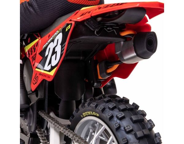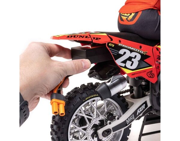Um den vorbildgetreuen Look zu gewährleisten, mussten die Elektronik und der Akku des Motorrads in ein kompaktes, schmales Chassis passen. Die Notwendigkeit eines speziellen „Shorty"-Akkus hätte die Konstruktionsaufgabe vereinfacht, aber das Entwicklerteam des Promoto-MX wollte einen praktischen Akku in Standardgröße verwenden. Mission erfolgreich! Ein vollwertiger 2S-Hardcase-LiPo passt unter den Fahrersitz und ist für einen schnellen Akkuwechsel leicht zugänglich. Schnappe dir einen aufgeladenen Akkupack und schon bist du in Sekundenschnelle wieder dabei, die Konkurrenz zu dominieren.