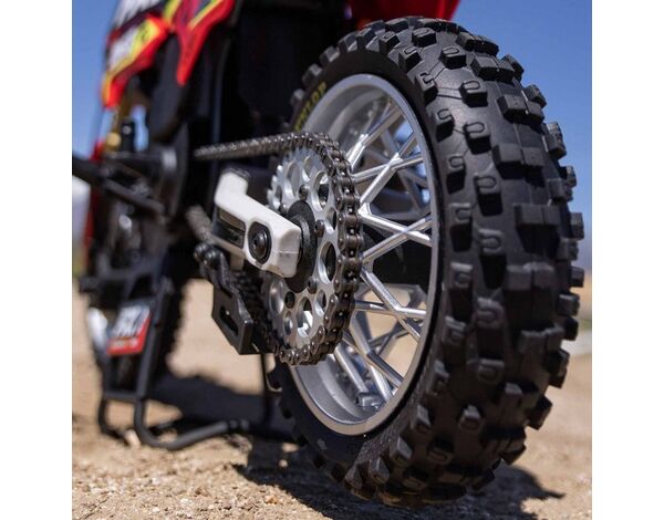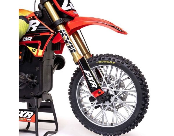 Die realistischen, echten Speichenräder sind eine weitere Premiere am Promoto-MX. Kein anderer RC-Hersteller war in der Lage, gutaussehende Speichenräder mit der für ein Motocross erforderlichen Haltbarkeit herzustellen. Um dies zu erreichen, brauchte es die Entschlossenheit und das Fachwissen der Losi-Entwickler.