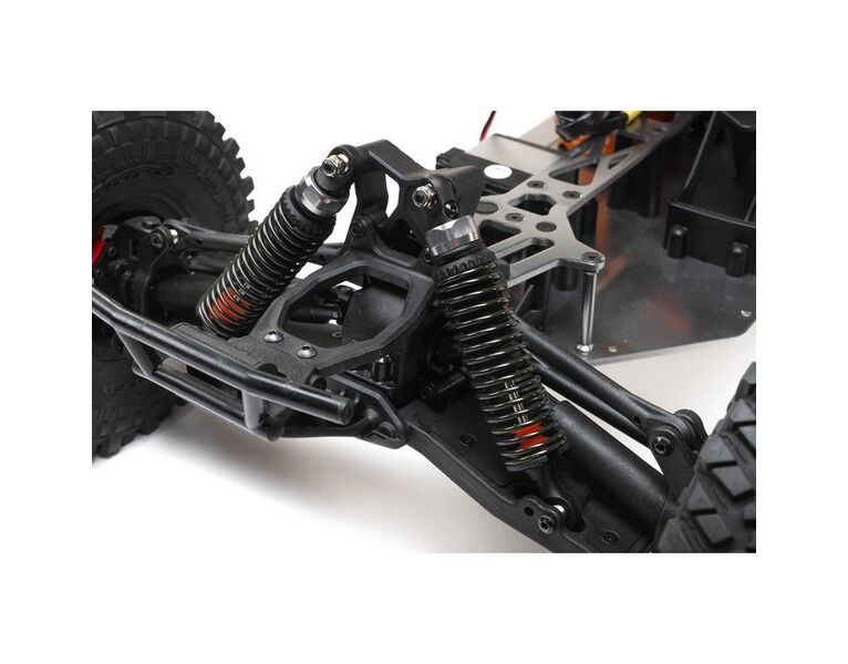 Die Stoßdämpfer mit langem Federweg machen einen fantastischen Job, um die Energie von großen Unebenheiten und Sprüngen aufzusaugen. Sie verfügen außerdem über Stoßdämpfer mit Gewinde und Einstellringen, sodass du die Vorspannungseinstellungen der Gewindefedern fein einstellen kannst.