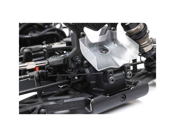 Um zu verhindern, dass die Servohalterung die Chassis Felxibilität beeinträchtigt, wird das Servo hängend über dem Chassis montiert. Die Halterung wird in der Nähe der Mittellinie des Chassis am Chassis befestigt und besteht aus einer stabilen 2,5-mm-Kohlefaserplatte, um das Gewicht und die Krafteinwirkung des Servos aufzunehmen, und um die Lenkleistung und den Chassis-Flex zu optimieren. Die V2-Version bedient auch alle Servo-Offsets.