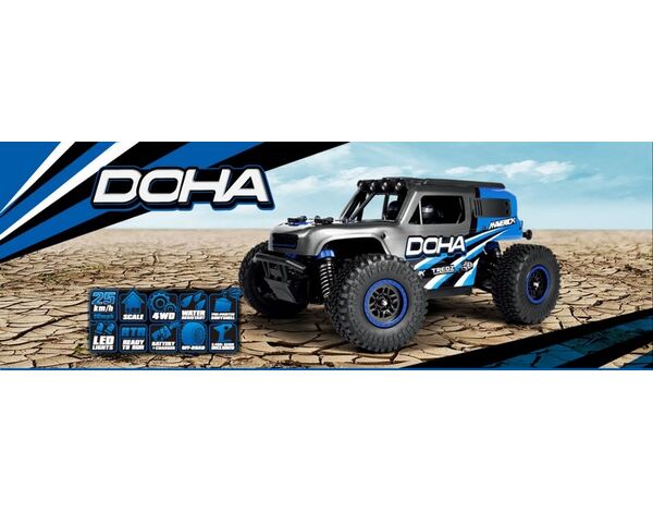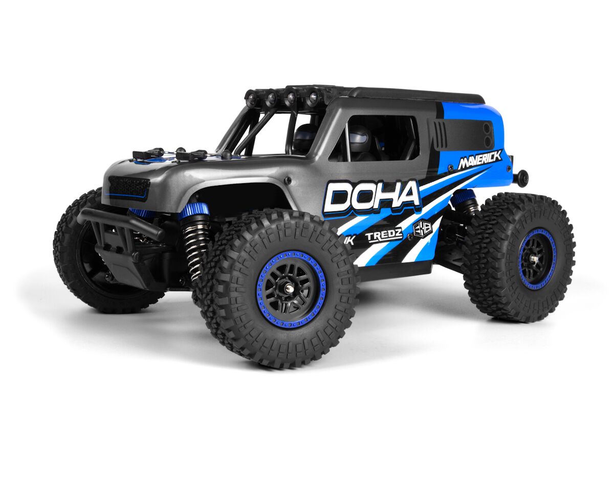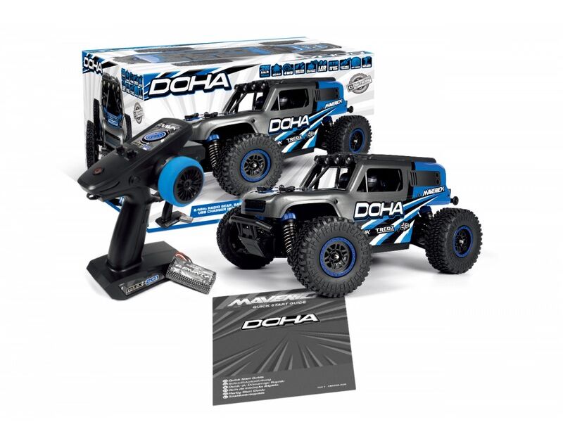 Merkmale und Funktionen: Der Lkw ist mit LED-Leuchten auf dem Dachkäfig ausgestattet, um auch bei schlechten Lichtverhältnissen eingesetzt werden zu können. Er wird mit einer Maverick Element 600mAh Lithium-Ionen-Batterie, einem praktischen USB-Ladegerät, dem MTX-201 2,4 GHz Funksystem und dem wasserfesten MSRS-201 2-in-1 Licht- und Geschwindigkeitsempfänger/-regler geliefert. „Der DOHA ist mit LED-Leuchten am Dachkäfig ausgestattet, die den Betrieb bei schlechten Lichtverhältnissen für eine längere Spielzeit nach Sonnenuntergang ermöglichen.“