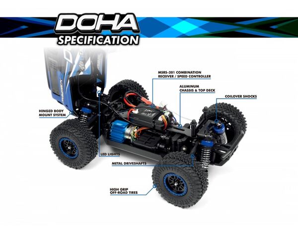 Einfache Bedienung: Der DOHA ist auf Benutzerfreundlichkeit ausgelegt, mit einer einfachen Einrichtung und einem MTX-201-Sender, der eine hervorragende Gas- und Lenkreaktion bietet. Ein Geschwindigkeitsbegrenzer, der die Drosselklappe des Senders nutzt, reduziert die Höchstgeschwindigkeit für Anfänger.