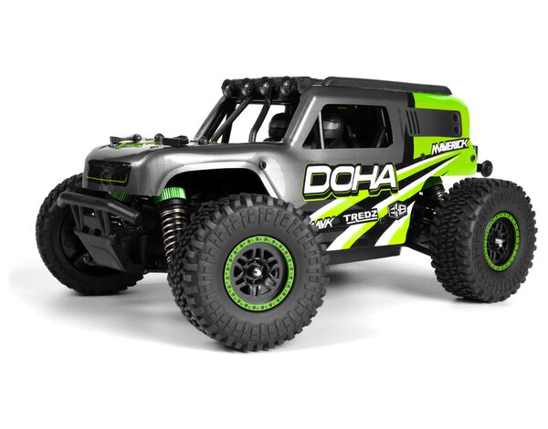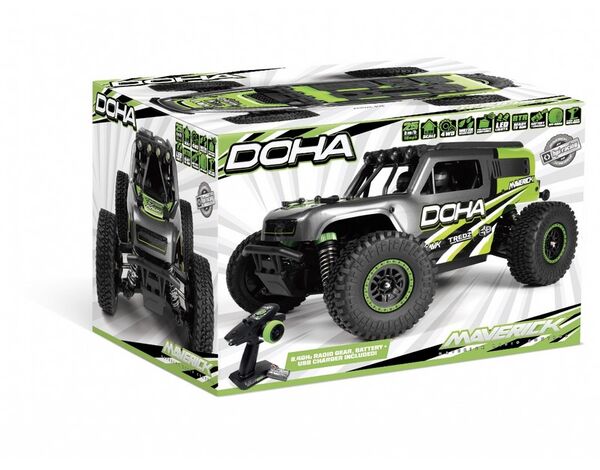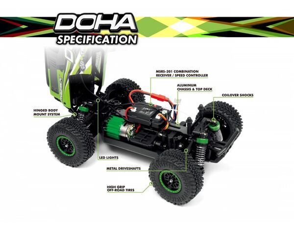 Merkmale und Funktionen: Der Lkw ist mit LED-Leuchten auf dem Dachkäfig ausgestattet, um auch bei schlechten Lichtverhältnissen eingesetzt werden zu können. Er wird mit einer Maverick Element 600mAh Lithium-Ionen-Batterie, einem praktischen USB-Ladegerät, dem MTX-201 2,4 GHz Funksystem und dem wasserfesten MSRS-201 2-in-1 Licht- und Geschwindigkeitsempfänger/-regler geliefert. „Der DOHA ist mit LED-Leuchten am Dachkäfig ausgestattet, die den Betrieb bei schlechten Lichtverhältnissen für eine längere Spielzeit nach Sonnenuntergang ermöglichen.“