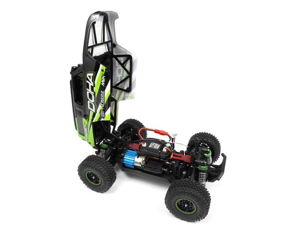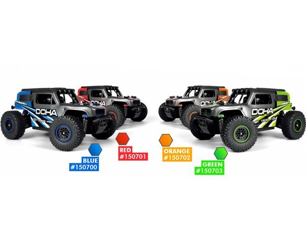 Design und Ästhetik: Der DOHA verfügt über ein verstärktes Käfigdesign und eine individuell gestaltete, auf Leinwand gedruckte und hinten angeschlagene Desert Truck-Karosserie, die in vier verschiedenen Farben erhältlich ist. Die Stoßdämpfer, der Motorkühlkörper und die Räder sind auf die Farbe der Karosserie abgestimmt, was den visuellen Reiz erhöht.