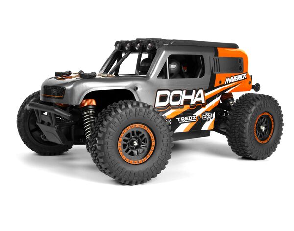 Merkmale und Funktionen: Der Lkw ist mit LED-Leuchten auf dem Dachkäfig ausgestattet, um auch bei schlechten Lichtverhältnissen eingesetzt werden zu können. Er wird mit einer Maverick Element 600mAh Lithium-Ionen-Batterie, einem praktischen USB-Ladegerät, dem MTX-201 2,4 GHz Funksystem und dem wasserfesten MSRS-201 2-in-1 Licht- und Geschwindigkeitsempfänger/-regler geliefert. „Der DOHA ist mit LED-Leuchten am Dachkäfig ausgestattet, die den Betrieb bei schlechten Lichtverhältnissen für eine längere Spielzeit nach Sonnenuntergang ermöglichen.“