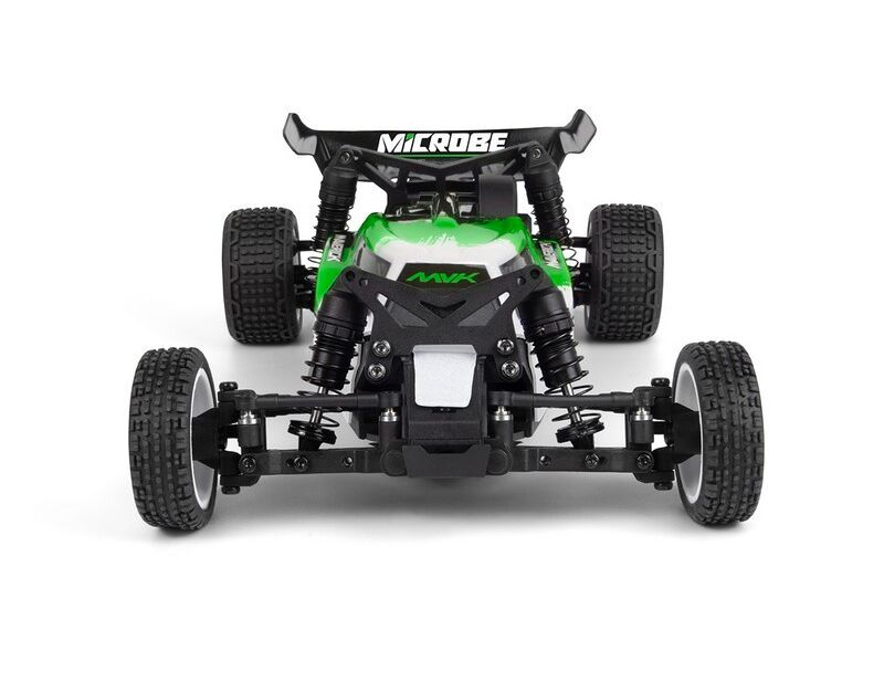 Ein schlankes 1,5 mm starkes Chassis aus eloxiertem Aluminium, ein vollständig kugelgelagerter Antriebsstrang und ein leichtgängiges 3-Gang-Heckgetriebe sorgen gemeinsam für ein stabiles, präzises Fahrgefühl des Microbe. Dazu kommen ölgefüllte Gewindefahrwerke und belüftete Räder mit Schaumstoffeinlagen – und schon haben Sie einen winzigen Buggy, der gerne Kurven nimmt, Unebenheiten abfedert und mit Zuversicht aus Kurven herausschießt.