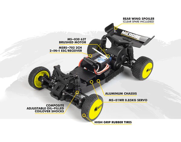 Ein schlankes 1,5 mm starkes Chassis aus eloxiertem Aluminium, ein vollständig kugelgelagerter Antriebsstrang und ein leichtgängiges 3-Gang-Heckgetriebe sorgen gemeinsam für ein stabiles, präzises Fahrgefühl des Microbe. Dazu kommen ölgefüllte Gewindefahrwerke und belüftete Räder mit Schaumstoffeinlagen – und schon haben Sie einen winzigen Buggy, der gerne Kurven nimmt, Unebenheiten abfedert und mit Zuversicht aus Kurven herausschießt.