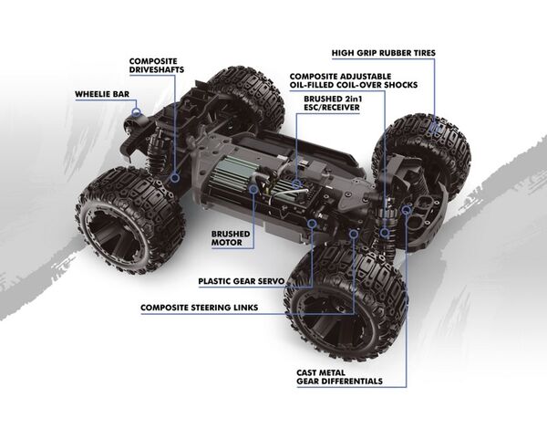 Ein widerstandsfähiges Kunststoffchassis mit vollwertiger Doppelquerlenkeraufhängung und geschütztem Antriebsstrang. Der 390 Brushed Motor liefert lineare Kraftentfaltung und sorgt für saubere Beschleunigung. Clipless Karohalter ermöglichen schnellen Zugriff ohne Kleinteile. Front und Heck sind mit LED Lichtern ausgestattet, was die Sichtbarkeit verbessert. Die kompakte 2 in 1 Einheit aus Empfänger und Regler macht das Modell wartungsarm und einfach handhabbar.