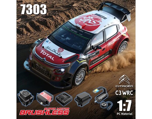 Der MJX Hyper GO 7303 Citroën C3 WRC ist ein kraftvolles 1/7 Rally RC-Car mit einem sensored Brushless-Antrieb. Das Metall-Chassis, die komplett metallischen Antriebskomponenten und das heavy-Duty Fahrwerk verleihen dem 7303 eine beeindruckende Mischung aus High-Speed-Performance und "Rally-Ruggedness". Mit einem 3974 Sensored Brushless Motor (2500 KV), einem 120A Brushless-Regler (ESC) und einem kräftigen 35 kg Metallservo kann man Geschwindigkeiten von bis zu 60 km/h erreichen, perfekt für adrenalingeladene Drift-Manöver und aggressive Rally-Einsätze!