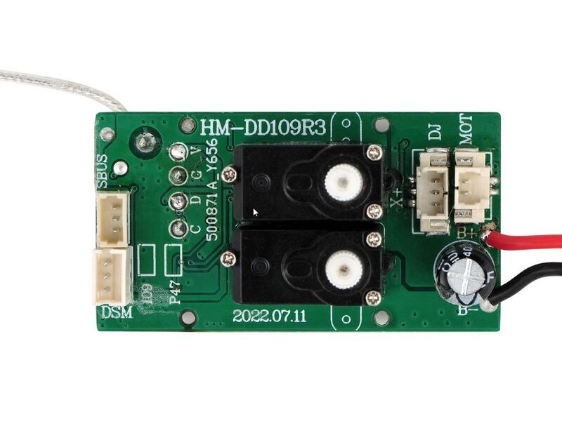 Das Hauptelektronik-Board der MDX PRO BF 109 ist mit einem 3-poligen DSMX- sowie einem S-Bus Anschluss-Port ausgestattet (siehe Bild), welche die Nutzung von optionalen, externen 3-poiligen DSMX-Satelliten oder S-Bus-Empfängern ermöglicht.