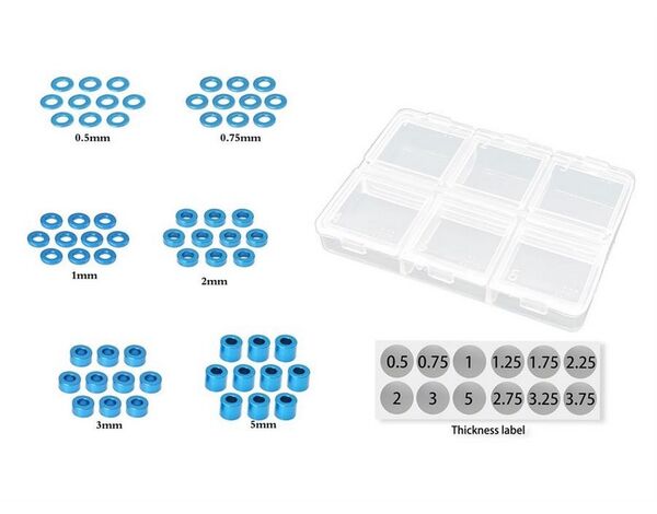 MR33 Aluminum Unterlegscheiben Set 0.5,0.75,1,2,3,5mm jeweils 10pc Tamiya Blau
