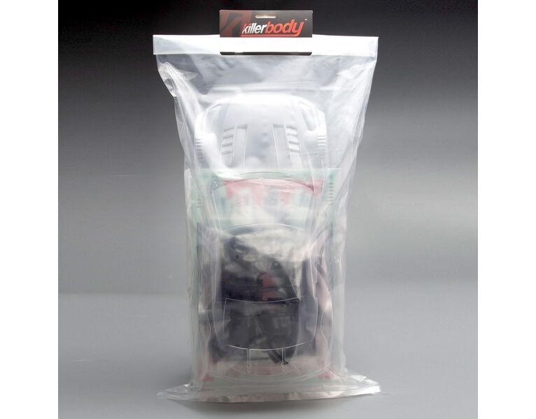 Unlackierte Karosse / Lackier-Schutzfolie und Fensterabkleber / Standard Decal Set / Schwarzes Anbauteile-Set (Plastik) / Anbauteile Set (Lexan) / Lufteinlassgitter (rostfreier Stahl) / Beutel mit diversen Kleinteilen / Anleitung