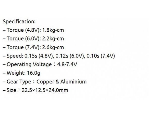 Torque(4.8V): 1.8 kg-cm (25.0 oz/in)