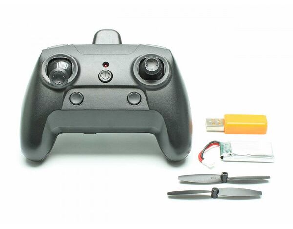 Als Akku liefern wir einen modernen LiPo mit, der Flüge bis über 10 Minuten (je nach Flugstil) ermöglicht. Zum Lieferumfang gehört außerdem noch bquemer USB Ladestecker und zwei Ersatzpropeller.