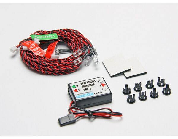 Verbinden Sie einfach die steckerfertigen LED-Kabel mit der LM-1 Steuereinheit und verbinden Sie das ganze mit einer Stromquelle von 4-6 Volt (z.B. an einem freien Empfängersteckplatz einstecken).