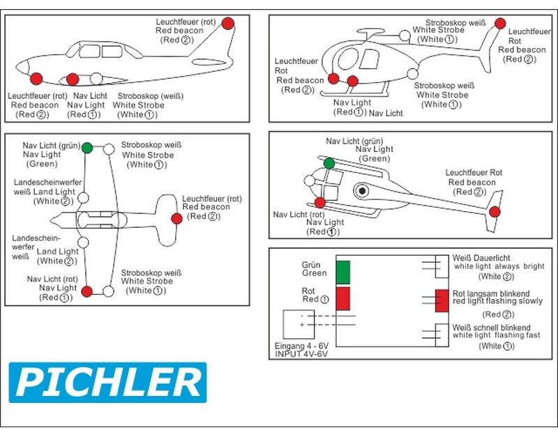 Verbinden Sie einfach die steckerfertigen LED-Kabel mit der LM-1 Steuereinheit und verbinden Sie das ganze mit einer Stromquelle von 4-6 Volt (z.B. an einem freien Empfängersteckplatz einstecken).