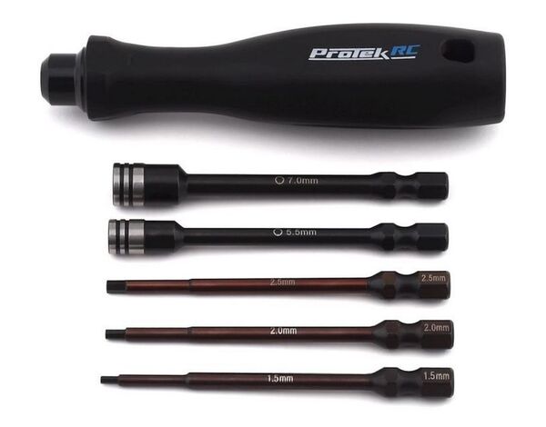 Das ProTek RC "TruTorque" 5-teilige 1/4" Drive Hex & Nut Driver Set ist ein großartiges Werkzeugset. Dieses kleine und kompakte Set eignet sich hervorragend für RTRs, Rennchassis und Trailbags. Es verfügt über 1/4"-Antriebsstahl-Sechskant-Aufsätze, kombiniert mit 1/4"-Antriebsstahl-Mutternschlüssel-Aufsätzen und einem ergonomisch geformten Griff aus Verbundwerkstoff, der von Händen jeder Größe leicht zu bedienen ist. Der Satz enthält 1,5-mm-, 2,0- und 2,5-mm-Innensechskant-Aufsätze sowie 5,5-mm- und 7,0-mm-Steckschlüssel-Aufsätze. Diese Spitzen passen genau in die Griffhülse und können auch in einem 1/4"-Antriebsschrauber verwendet werden! Ein geformter Kunststoffhalter für die Spitzen ist im Lieferumfang enthalten, der alle fünf Spitzen sicher hält. Wenn Sie auf der Suche nach einem Werkzeugset für den Einstieg sind oder einfach nur ein zweites Set für Ihre Reisetasche suchen, ist dieses 5-teilige Set eine gute Wahl für Piloten und Fahrer gleichermaßen.
