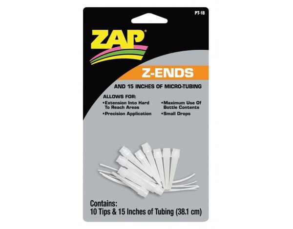 Verlängerungsspitzen zum leichteren Dosieren kleinerer Tropfen ZAP Kleber. Zehn Spitzen und ein 30 cm langer Mikrodosierungs-Schlauch. Passt auf alle ZAP Flaschen.