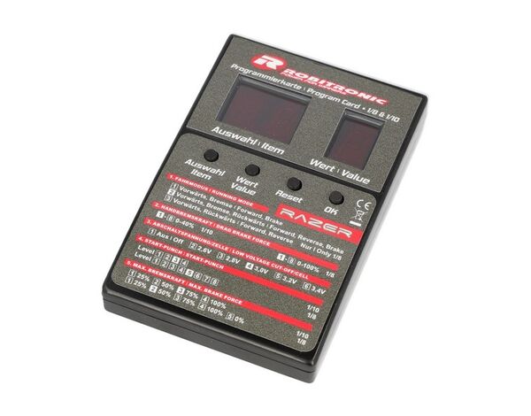 Diese LED-Programm-Box ist geeignet für die Programmierung der Robitronic Razer ten & eight Regler. Die Programmierung der Regler erfolgt mit dieser LED-Programm-Box einfach und schnell. Klein genung um sie immer einsatzbereit dabei zu haben.