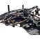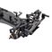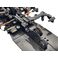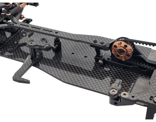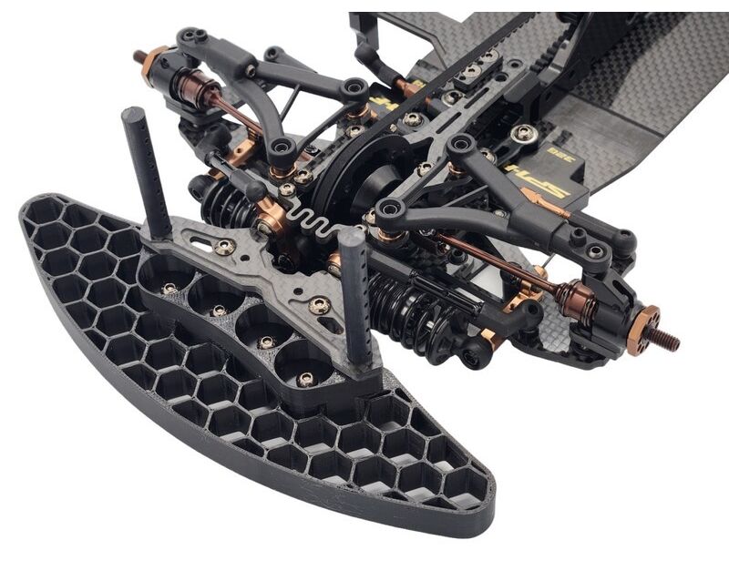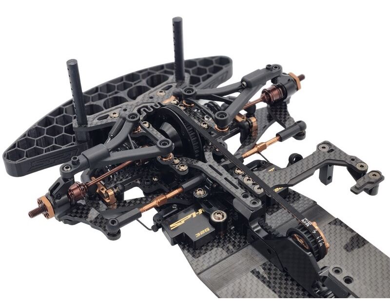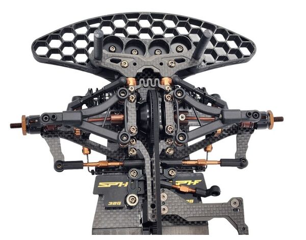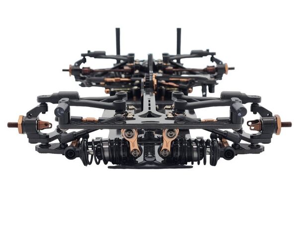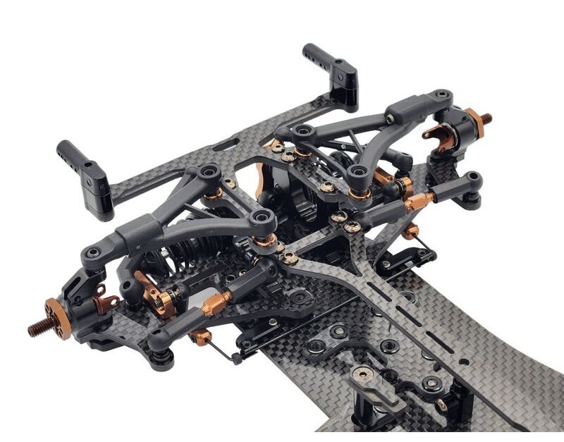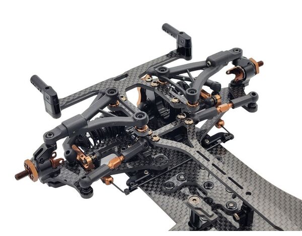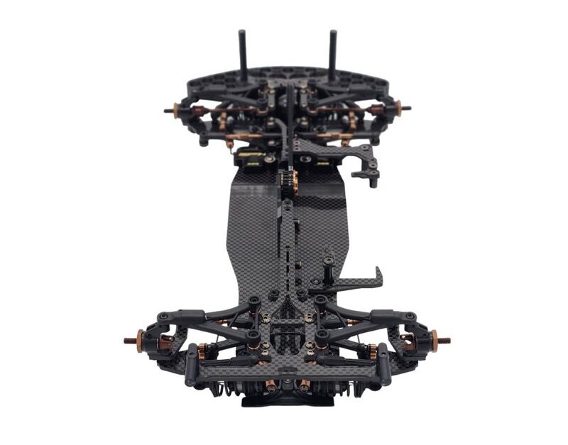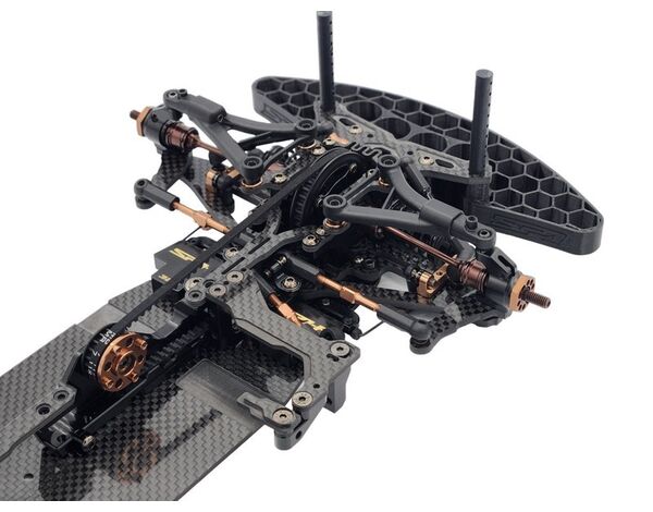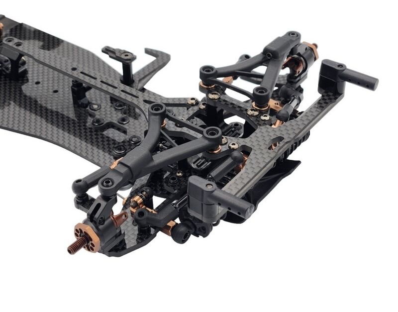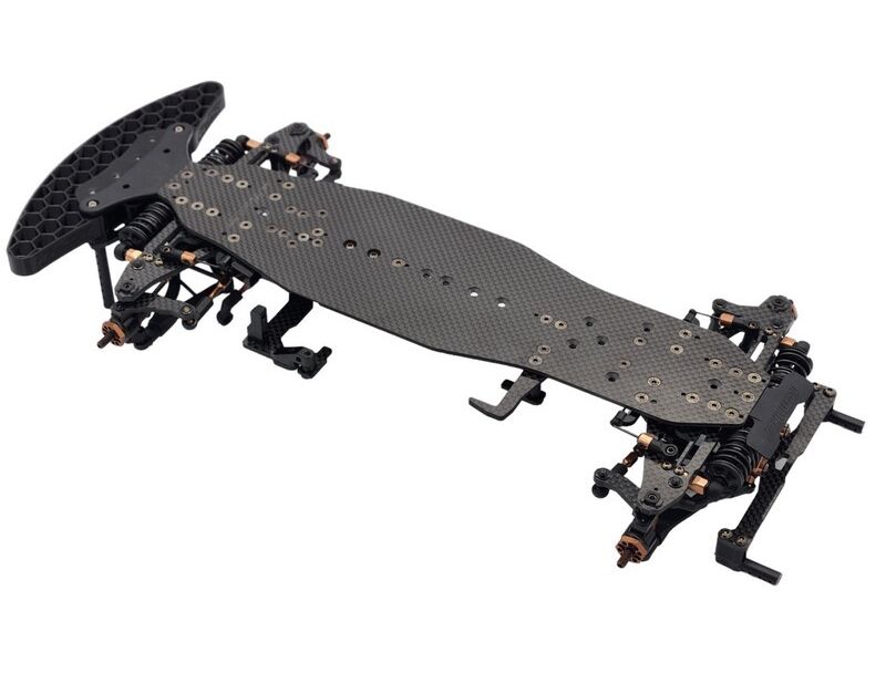 The short chassis reduces scrubbing, and also centralises the weight of all suspension components to reduce the moment of inertia. The suspension arms all taper in a way that allows the chassis to be short, while maintaining a normal wheelbase. This moves all screws, ball studs and cups towards the centre of the car. This makes the car more nimble, allowing it to change direction fast and rotate quickly in the corner for maximum corner speed. The chassis is also very narrow at only 82mm, and the profile minimised for reduced scrubbing in corners.