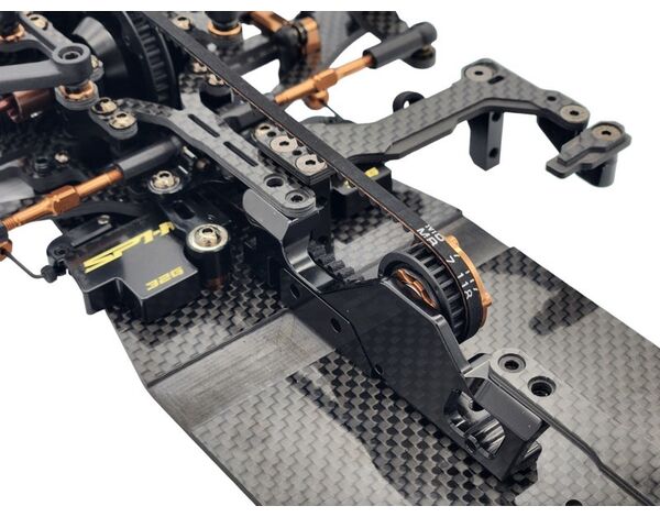 Battery installation is an important part of the car, being such a heavy component. The SP1 features the easily twistable tabs for quick changing of batteries. The kit includes carbon battery hooks, which can slide in and out for different battery widths. The battery fwd/back movement can also be tuned by the eccentric battery posts. Simply loosen and twist the post into different spots to tune the position or movement of the battery.