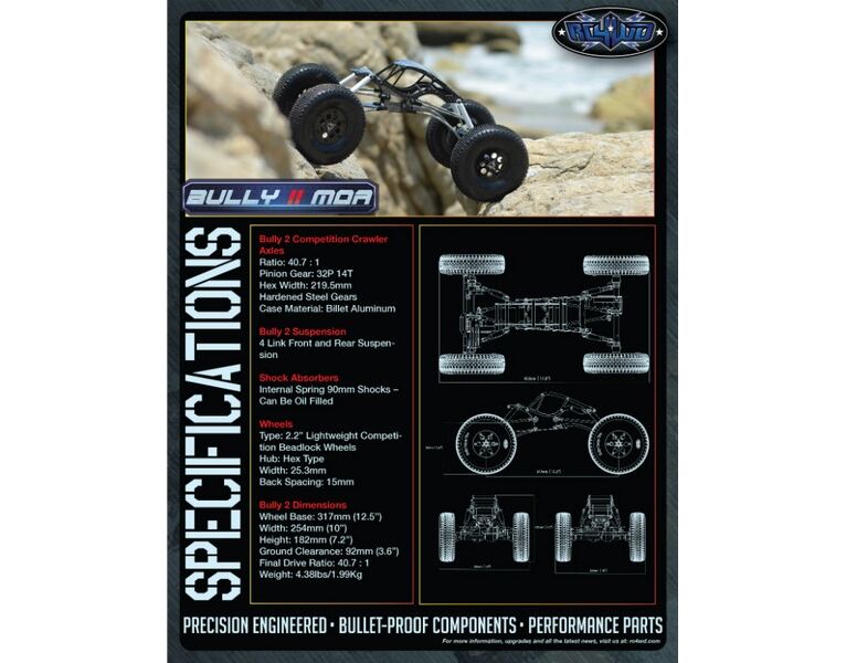 The Bully 2.2 MOA Competition Crawler Kit is ready to be built and compete. The Bully 2.2 offers unmatched features that include carbon fiber chassis, Bully 2.2 Competition CNC machined axles, aluminum shocks, titanium links, carbon fiber and delrin Rocker 2.2_ Beadlock Wheels and Bully Advanced X2SS Compound Competition Tires.