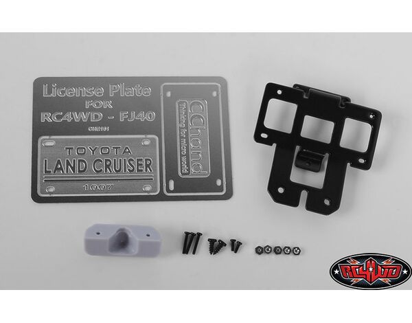 VVV-C0464 RC4WD Rear License Plate System for WD G2 Cruiser Specifications: Stamped Brushed Aluminum Laser Engraving Stainless Steel Specialty Bending Process Black Powder-Coated Finish Corrosion Resistant Total Length: 2.38in / 60.29mm Total Width: 1.58in / 40.32mm Weight: 0.39oz / 11.0g What’s Included: 1x Rear License Plate System for RC4WD G2 Cruiser 1x Black Mounted Plate 1x Plastic Mounted Block 3x M1 x 6mm Cross Head Cap Screws (Black) 2x M1 x 3mm Cross Head Cap Screws (Black) 2x M1.4 x 4mm Cross Head Self Tapping Screws (Black) 5x Regular M1.0 Nuts (Silver) Notes: Fits RC4WD Gelande II RTR Truck Kit w/Cruiser Body Set (Z-RTR0029) Fits RC4WD Gelande II Truck Kit w/Cruiser Body Set (Z-K0051) To install, you will need to drill several 1mm mounting holes.