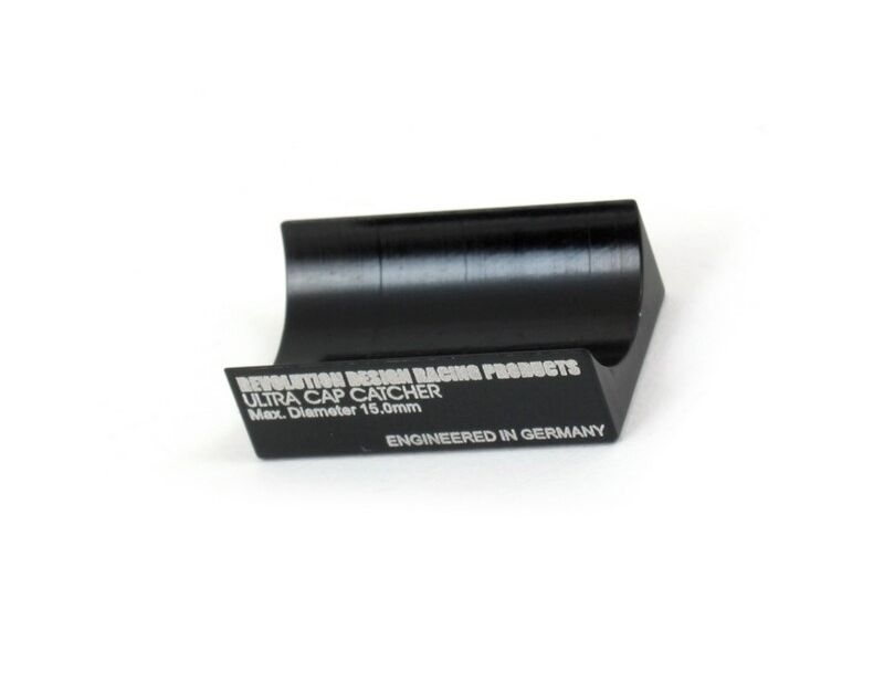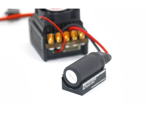 RDRP0009 Revolution Design Ultra Cap Catcher The Ultra Cap Catcher is best used with larger diameter capacitors but also works just perfect with smaller caps thanks to the crescent-shaped design. When the cap is installed with heat-conductive tape the black anodised mount also acts as a heat sink. The RDRP Ultra Cap Catcher is a simple but genius mount that holds separated speed controller capacitors such as found on Vampire Racing, Novak or LRP speedos. It is machined from a piece of high-quality 7075-T6 aluminium and holds capacitors with a diameter of up to 15mm. Instead of having the capacitor unsightly attached using cable ties or large amounts of double-sided tape, the capacitors is fixed using a single layer of tape and the Ultra Cap Catcher mounted near the controller or wherever it may suit your needs. The large surface for both the capacitor and the chassis mounting area makes for secure fastening without having to worry about loosened caps anymore. Small dimensions hel