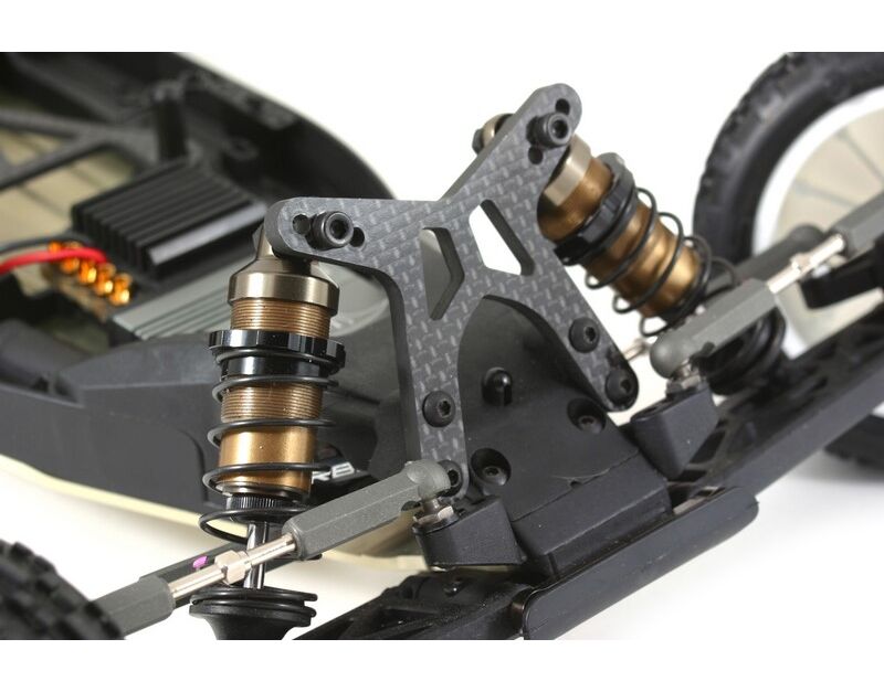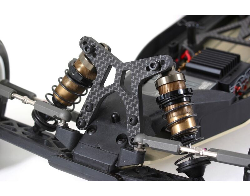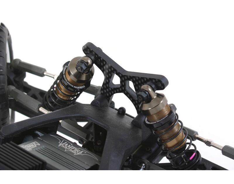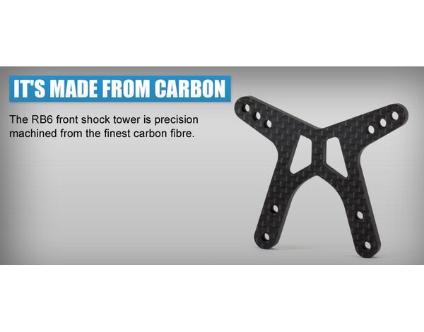 The Revolution Design Racing Products carbon fibre front shock tower is CNC-machined from high quality 4mm carbon fibre and made to replace the standard composite plastic part with a more rigid solution. It mimics the kit's geometry while offering additional clearance for the shocks cabs and thumb screws to make setup and maintenance easy.