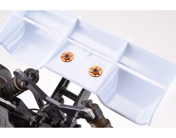 The Revolution Design Racing Products Buggy Wing Buttons are designed to improve wing fitment and security on both 1/8th and 1/10th scale buggies. Machined from aircraft-grade aluminium the buttons help to securely fasten both polycarbonate and moulded wings, prolonging the life of both the wing mount and wing. Machined holes for countersunk screws make for easy and convenient wing mounting, with the buttons being usable with most wing mounts that use screws over the standard body clip solution. The buttons come in the five different colours of "Tamiya" light blue, "Yokomo" dark blue, black, orange and red.