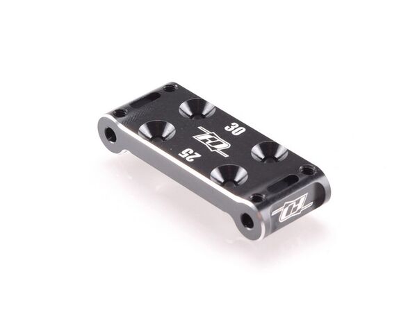 Revolution Design Racing Products' Aluminium Steering Rack was designed to replace the standard part with a more sturdy and durable item. The rack is machined from 7075-T6 aluminium and it comes black or blue anodised for wear and looks. On top of this does a machined silver edge detail let the part stand out while matching its visual appearance with the remainder of RDRP's Team Associated series option parts. The steering rack is a direct replacement and used solely or in combination with RDRP's Aluminium Steering Bellcranks, it makes for improved steering response when running in high-bite track conditions