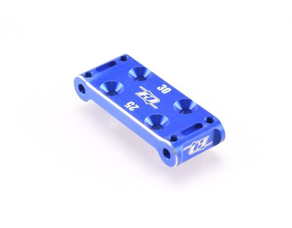 Revolution Design Racing Products' Aluminium Steering Rack was designed to replace the standard part with a more sturdy and durable item. The rack is machined from 7075-T6 aluminium and it comes black or blue anodised for wear and looks. On top of this does a machined silver edge detail let the part stand out while matching its visual appearance with the remainder of RDRP's Team Associated series option parts. The steering rack is a direct replacement and used solely or in combination with RDRP's Aluminium Steering Bellcranks, it makes for improved steering response when running in high-bite track conditions