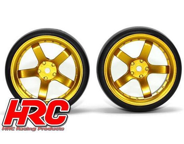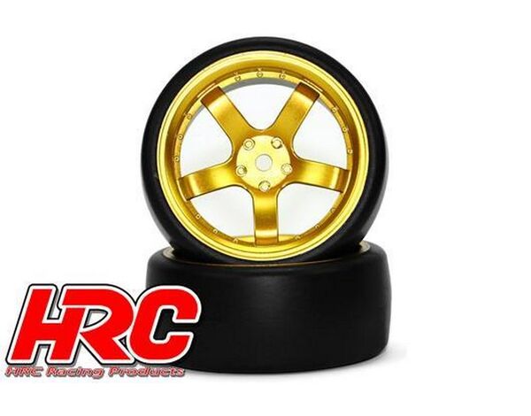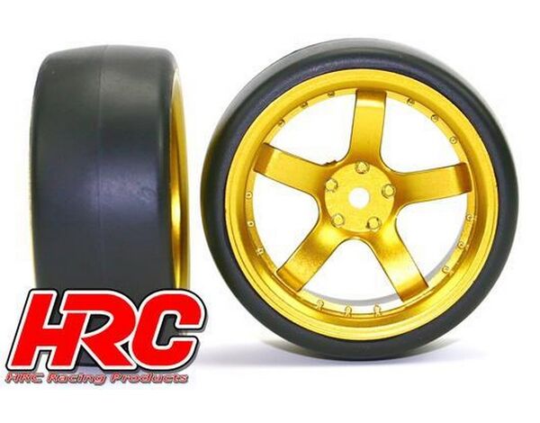 HRC61072GD Tires - 1/10 Drift - mounted - 5-Spoke Gold Wheels 6mm Offset - Slick (2 pcs)