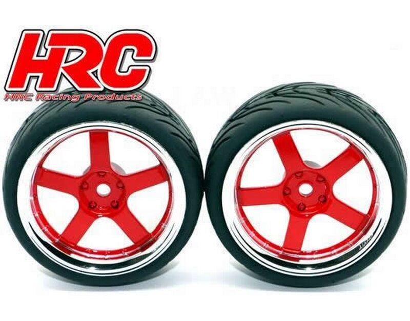 HRC61011/2 Reifen - 1/10 Touring - montiert - Split-Six Rot/Chrome Felgen - 12mm hex - HRC High Grip Street-V (2 Stk.)